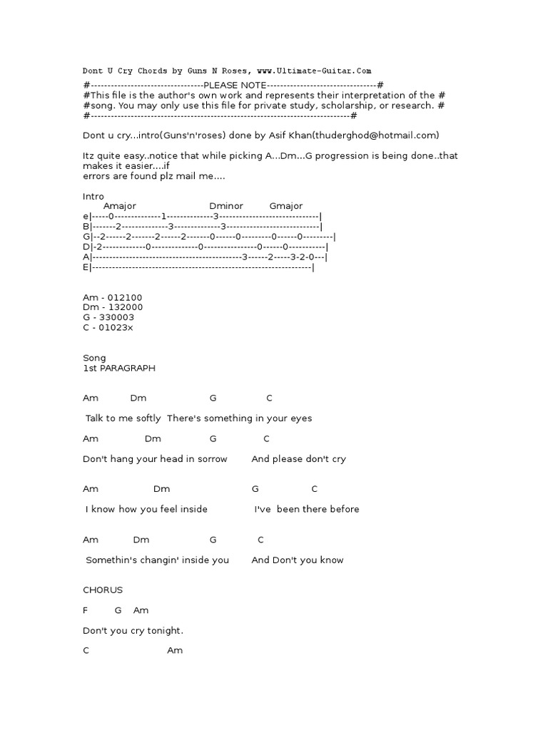 F G Am And dont you cry tonight. Dont Cry - Guns N Roses Talk to me softly There is something in your eyes Dont hang your head in sorrow.